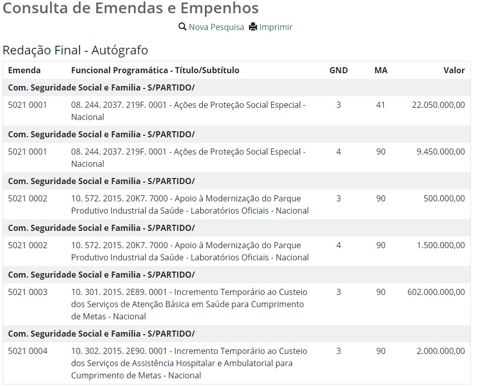 A Comissão de Seguridade Social aprovou duas emendas 50210003 e 50210004, nos valores de R$ 602 milhões e R$ 2 milhões, respectivamente. No entanto, foram liberados pelo governo R$ 652.629.444,00 e R$ 395.884.450,00 pelas mesmas emendas, respectivamente. Ou seja, o governo autorizou o empenho de mais de R$ 444 milhões sem autorização legislativa.