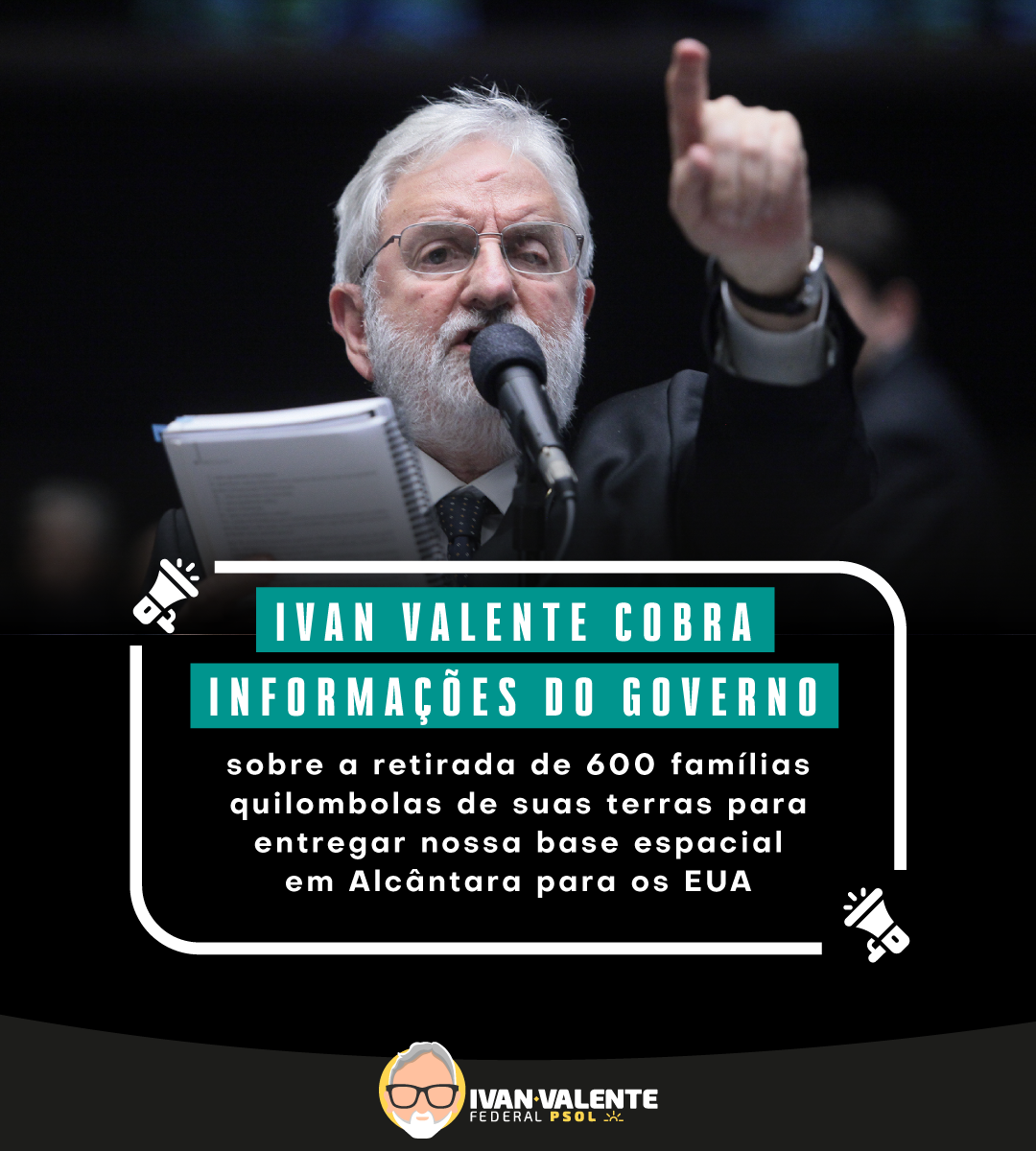 Deputado Ivan Valente cobra informações do Governo sobre a retirada de 600 famílias quilombolas de suas terras para entregar nossa base espacial em Alcântara para os EUA. A bancada do PSOL luta na Câmara contra a tentativa do governo de atropelar o debate e aprovar o Acordo que entrega nossa base aos estadunidenses, ferindo gravemente nossa soberania e violando o direito das famílias quilombolas às suas terras. Por que o governo teme o debate sobre um tema tão importante? Por que se recusa a ouvir as famílias quilombolas que serão gravemente atingidas? Uma medida sensível como esta jamais poderia ser aprovada sem que os parlamentares tivesse o máximo de informações e, principalmente, sem que se tenha consultado os principais atingidos, as famílias quilombolas que mais uma vez correm o risco de terem seus direitos ignorados pelo poder público.