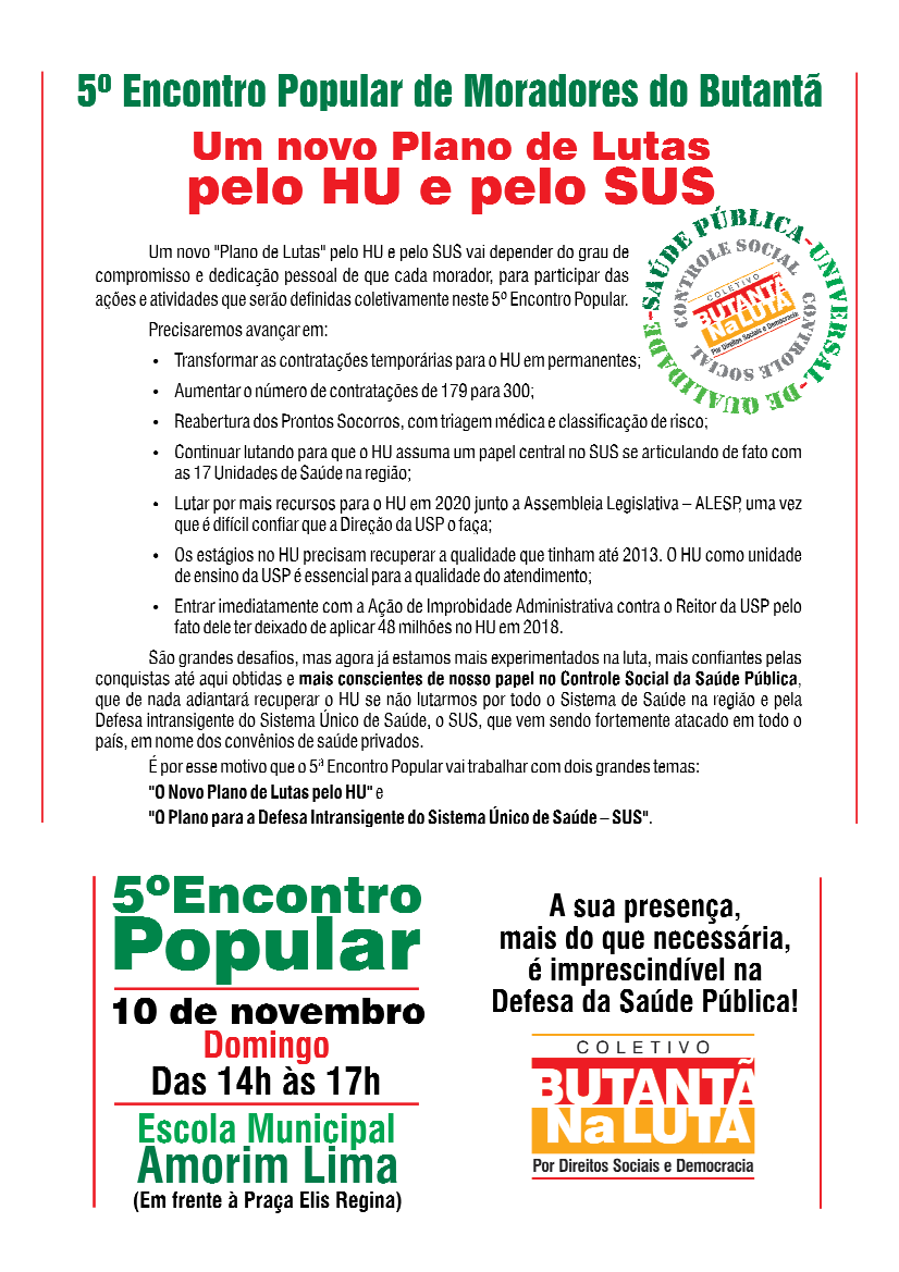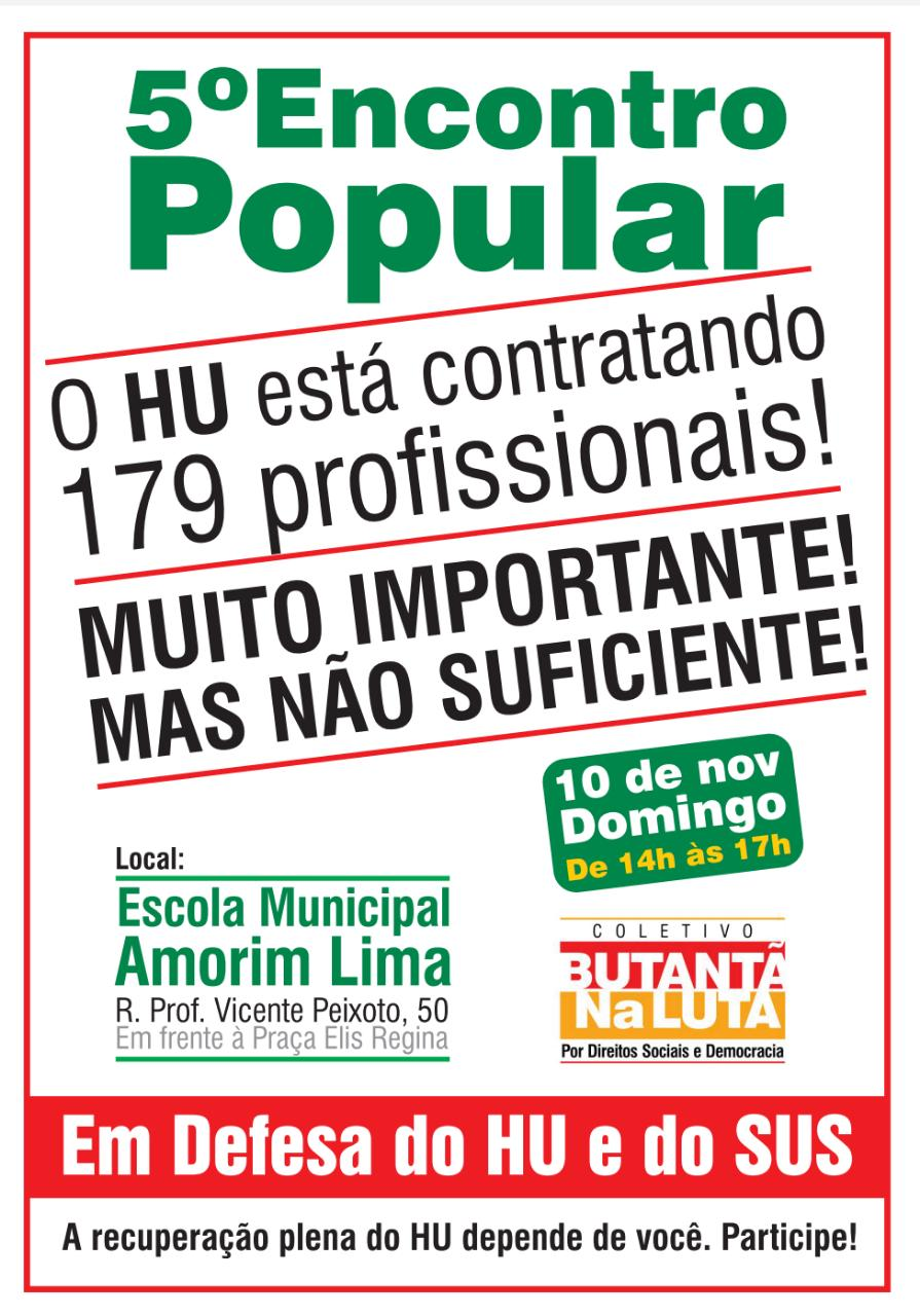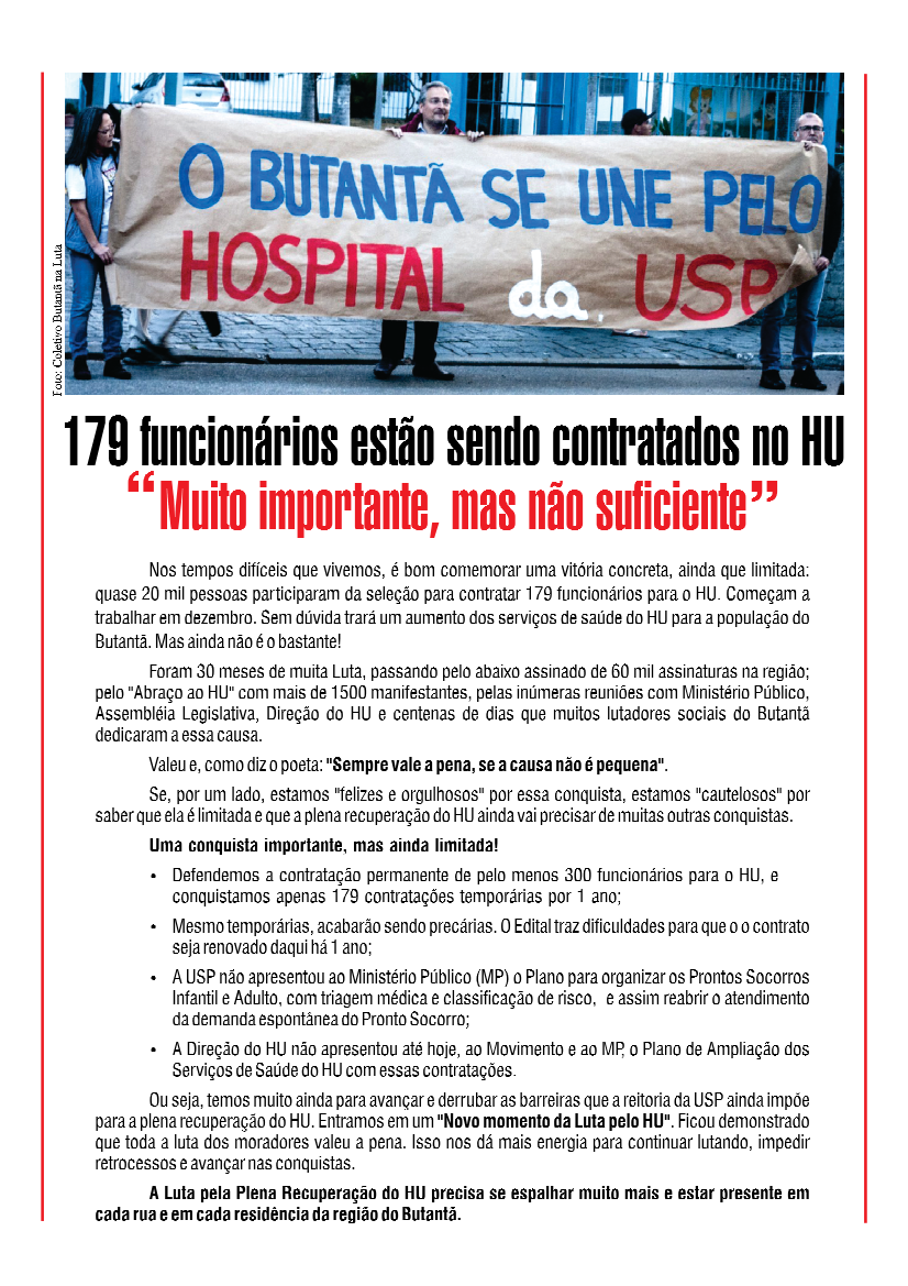 Conseguimos um grande avanço na luta pela revitalização do nosso Hospital universitário da USP, o HU, teremos 179 novas contratações de profissionais de saúde para nosso hospital. No entanto essas contratações serão em caráter temporário, por um ano, ainda com uma clausula chamada “duzentena” que impede que o profissional contratado renove seu contrato antes de completar 200 dias apos termino do seu contrato. Temos que nos organizar para em primeiro lugar aumentar o número de contratações, e torna-las definitivas via carreira da UPS. Em segundo lugar, derrubar imediatamente essa clausula, que inviabiliza a continuidade dos bons profissionais, prejudicando o caráter de ensino e pesquisa do HU. Vamos organizar essa nova fase de luta pelo HU, e aprofundar o debate sobre a saúde no Butantã, e no município. Juntos pelo HU e pelo SUS.